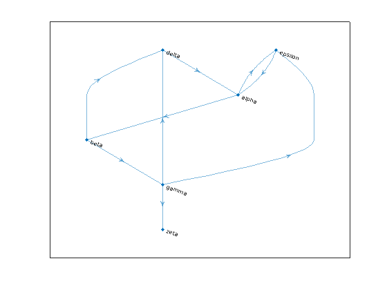 plot(G,'Layout','layered', ... 'NodeLabel',{'alpha','beta','gamma','delta','epsilon','zeta'})