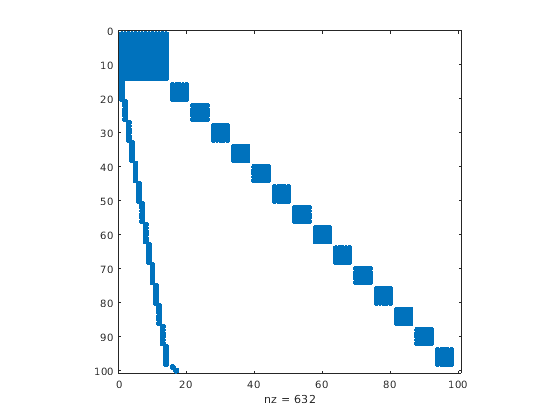Загрузите данные в mathworks100.mat и просмотрите матрицу смежности, A. Эти данные были сгенерированы в 2015 году с помощью автоматического обходчика страниц. Поиск страниц начался в https://www.mathworks.com и следовали по ссылкам на последующие веб-страницы, пока матрица смежности не содержала информацию о соединениях 100 уникальных веб-страниц.
