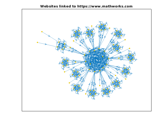 plot(G,'NodeLabel',{},'NodeColor',[0.93 0.78 0],'Layout','force'); title('Websites linked to https://www.mathworks.com')