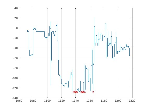 cla; plot(Time1, SumSig); hold on Saturated = (SumSig == intmin('int8')) | (SumSig == intmax('int8')); % Find where it has saturated plot(Time1(Saturated),SumSig(Saturated),'rd') grid hold off