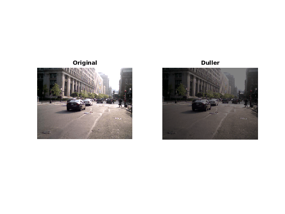 subplot(1,2,1); image(street2); axis off equal tight title('Original'); % Display image subplot(1,2,2); image(duller); axis off equal tight title('Duller'); % Display image