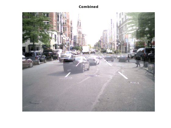 combined = street1 + duller; % Add |uint8| images subplot(1,1,1) cla; image(combined); % Display image title('Combined'); axis equal axis off