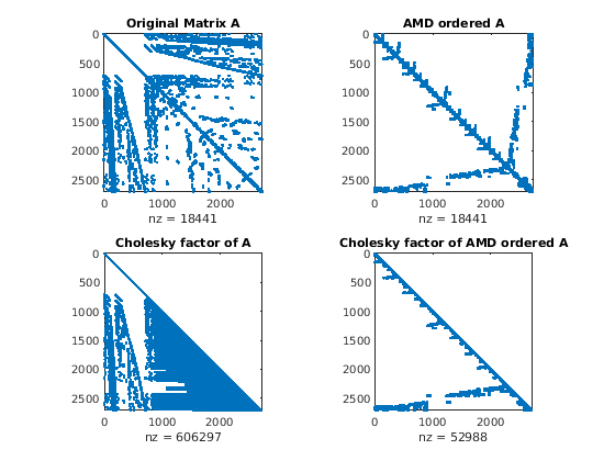 P = amd(A) возвращает приблизительный вектор сочетания минимальной степени для разреженной матрицы C = A + A'. Область Факторизации Холесского C(P,P) или A(P,P) имеет тенденцию быть рассеяннее, чем у C или A. amd функция имеет тенденцию быть быстрее, чем symamd, а также имеет тенденцию возвращать лучшие упорядоченные расположения, чем symamd. Матричные A должен быть квадратным. Если A является полной матрицей, тогда amd(A) эквивалентно amd(sparse(A)).