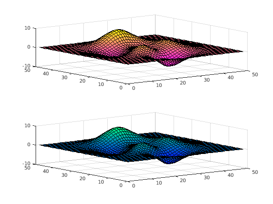 Начиная с R2019b, можно отобразить плиточное размещение графиков с помощью tiledlayout и nexttile функций. Вызовите tiledlayout функция для создания мозаичного графика размещения 2 на 1. Вызовите nexttile функция для создания объектов осей ax1 и ax2. Задайте разную палитру для каждой оси путем передачи объекта осей в colormap функция. В верхних осях создайте объемную поверхностную диаграмму с помощью spring палитра. В нижних осях создайте объемную поверхностную диаграмму с помощью winter палитра.