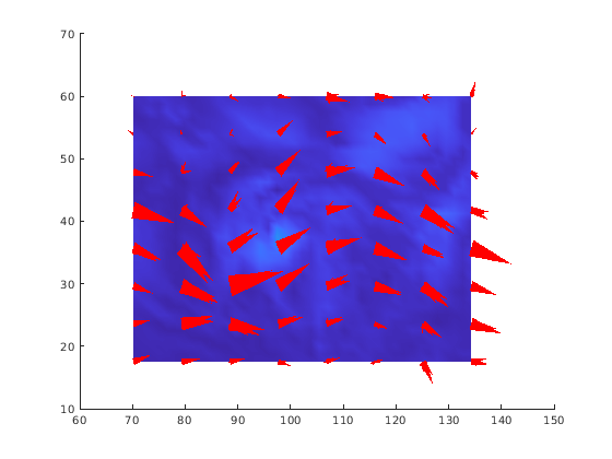 coneplot(...,color) интерполирует массив color на векторное поле и затем окрашивает конусы в соответствии с интерполированными значениями. Размер color массив должен быть того же размера, что и U, V, W массивы. Эта опция работает только с конусами (то есть не с quiver опция).