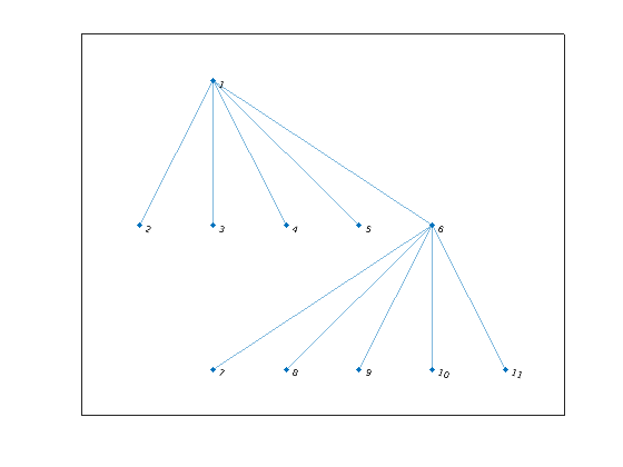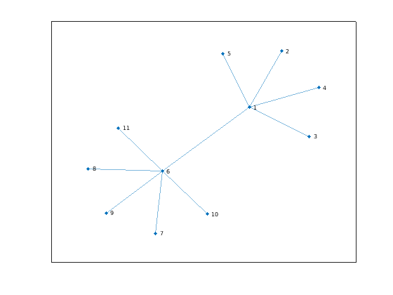 s = [1 1 1 1 1 6 6 6 6 6]; t = [2 3 4 5 6 7 8 9 10 11]; G = graph(s,t); h = plot(G,'Layout','force');
