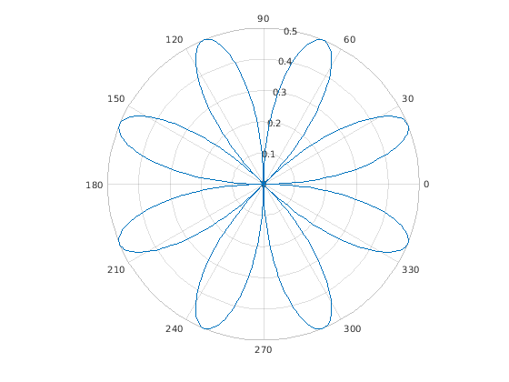 polarplot( строит графики линии в полярных координатах с theta,rho)theta указание угла в радианах и rho значение радиуса для каждой точки. Входами должны быть векторы с равной длиной или матрицы с равным размером. Если входами являются матрицы, то polarplot графики столбцы rho от столбцов theta. В качестве альтернативы, одним из входов может быть вектор, а другим - матрица, пока вектор является такой же длиной, как и одна размерность матрицы.