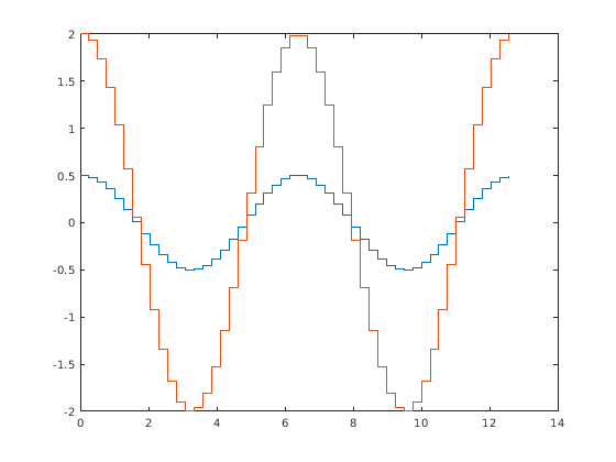 X = linspace(0,4*pi,50)'; Y = [0.5*cos(X), 2*cos(X)]; figure stairs(Y)