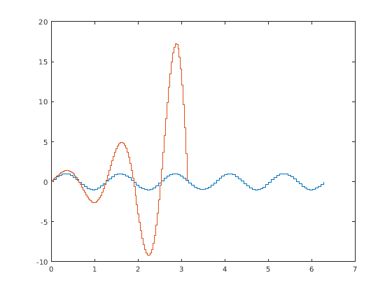 x1 = linspace(0,2*pi)'; x2 = linspace(0,pi)'; X = [x1,x2]; Y = [sin(5*x1),exp(x2).*sin(5*x2)]; figure stairs(X,Y)