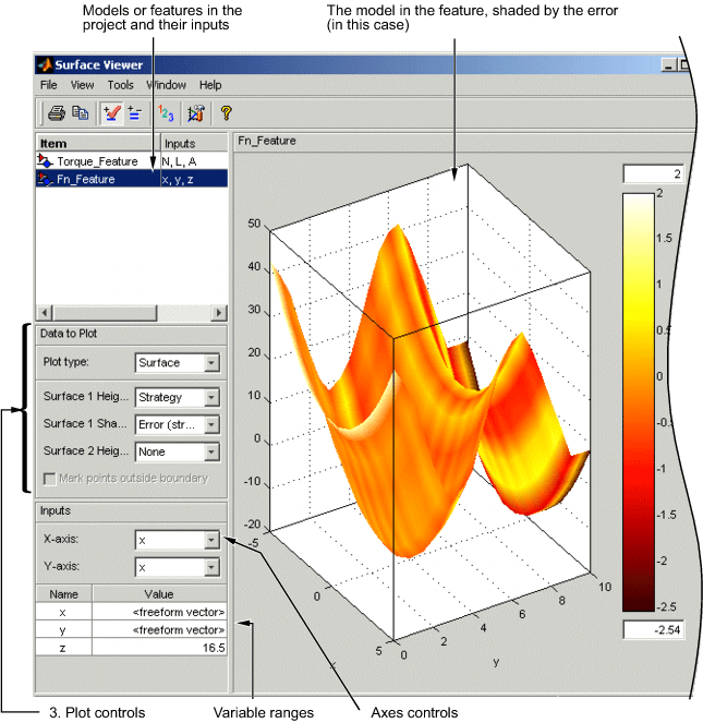 Для примера, когда вы просматриваете функцию, можно просмотреть или стратегию, модель, связанную с этой функцией, ошибку между моделью и стратегией или ошибку предсказания, если модель была импортирована из Model Browser. Можно также использовать один из этих факторов, чтобы затенить поверхность, образованную одним из других факторов, и можно выбрать любые два фактора, которые будут отображаться одновременно как две поверхности.
