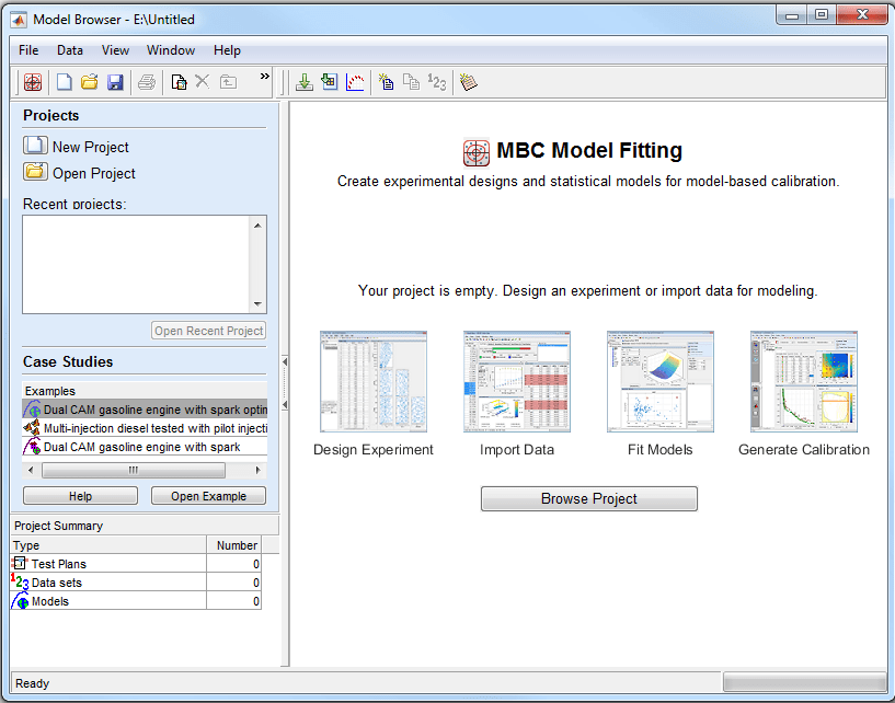 Просмотрите сводные данные планов тестирования, наборов данных и моделей в своем проекте. Чтобы открыть другие виды моделирования и просмотреть дерево модели, щелкните Обзор (Browse) Проект (Project).