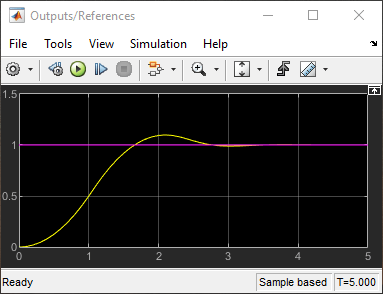 После симуляции графики двух возможностей показывают, что манипулируемая переменная не превышает предел, и выход объекта отслеживает опорный сигнал примерно через 3 секунды.