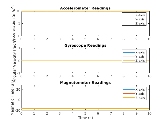 t = (0:(numSamples-1))/IMU.SampleRate; subplot(3,1,1) plot(t,accelReading) legend('X-axis','Y-axis','Z-axis') title('Accelerometer Readings') ylabel('Acceleration (m/s^2)') subplot(3,1,2) plot(t,gyroReading) legend('X-axis','Y-axis','Z-axis') title('Gyroscope Readings') ylabel('Angular Velocity (rad/s)') subplot(3,1,3) plot(t,magReading) legend('X-axis','Y-axis','Z-axis') title('Magnetometer Readings') xlabel('Time (s)') ylabel('Magnetic Field (uT)')