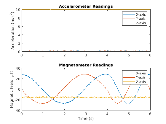 IMU = imuSensor('accel-mag','SampleRate',fs); IMU.Accelerometer = accelparams( ... 'MeasurementRange',19.62, ... % m/s^2 'Resolution',0.0023936, ... % m/s^2 / LSB 'TemperatureScaleFactor',0.008, ... % % / degree C 'ConstantBias',0.1962, ... % m/s^2 'TemperatureBias',0.0014715, ... % m/s^2 / degree C 'NoiseDensity',0.0012361); % m/s^2 / Hz^(1/2) IMU.Magnetometer = magparams( ... 'MeasurementRange',1200, ... % uT 'Resolution',0.1, ... % uT / LSB 'TemperatureScaleFactor',0.1, ... % % / degree C 'ConstantBias',1, ... % uT 'TemperatureBias',[0.8 0.8 2.4], ... % uT / degree C 'NoiseDensity',[0.6 0.6 0.9]/sqrt(100)); % uT / Hz^(1/2) [accelReadings,magReadings] = IMU(accNED,angVelNED,orientationNED); figure(1) t = (0:(totalNumSamples-1))/fs; subplot(2,1,1) plot(t,accelReadings) legend('X-axis','Y-axis','Z-axis') ylabel('Acceleration (m/s^2)') title('Accelerometer Readings') subplot(2,1,2) plot(t,magReadings) legend('X-axis','Y-axis','Z-axis') ylabel('Magnetic Field (\muT)') xlabel('Time (s)') title('Magnetometer Readings')