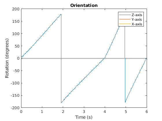 orientation = ecompass(accelReadings,magReadings); orientationEuler = eulerd(orientation,'ZYX','frame'); figure(2) plot(t,orientationEuler) legend('Z-axis','Y-axis','X-axis') xlabel('Time (s)') ylabel('Rotation (degrees)') title('Orientation')