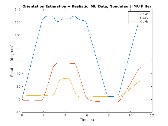 aFilter.GyroscopeNoise = 7.6154e-7; aFilter.AccelerometerNoise = 0.0015398; aFilter.GyroscopeDriftNoise = 3.0462e-12; aFilter.LinearAccelerationNoise = 0.00096236; aFilter.InitialProcessNoise = aFilter.InitialProcessNoise*10; orientationNondefault = zeros(numSamples,1,'quaternion'); for i = 1:numSamples [accelBody,gyroBody] = IMU(accNED(i,:),angVelNED(i,:),orientationNED(i,:)); orientationNondefault(i) = aFilter(accelBody,gyroBody); end release(aFilter) figure(3) plot(t,eulerd(orientationNondefault,'ZYX','frame')) xlabel('Time (s)') ylabel('Rotation (degrees)') title('Orientation Estimation -- Realistic IMU Data, Nondefault IMU Filter') legend('Z-axis','Y-axis','X-axis')