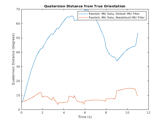 qDistDefault = rad2deg(dist(orientationNED,orientationDefault)); qDistNondefault = rad2deg(dist(orientationNED,orientationNondefault)); figure(4) plot(t,[qDistDefault,qDistNondefault]) title('Quaternion Distance from True Orientation') legend('Realistic IMU Data, Default IMU Filter', ... 'Realistic IMU Data, Nondefault IMU Filter') xlabel('Time (s)') ylabel('Quaternion Distance (degrees)')