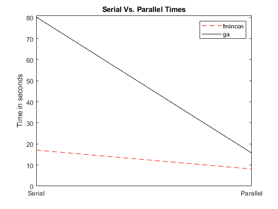 X = [time_fmincon_sequential time_fmincon_parallel]; Y = [time_ga_sequential time_ga_parallel]; t = [0 1]; plot(t,X,'r--',t,Y,'k-') ylabel('Time in seconds') legend('fmincon','ga') ax = gca; ax.XTick = [0 1]; ax.XTickLabel = {'Serial' 'Parallel'}; axis([0 1 0 ceil(max([X Y]))]) title('Serial Vs. Parallel Times')