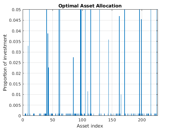 bar(xLinInt(xvars)) grid on xlabel('Asset index') ylabel('Proportion of investment') title('Optimal Asset Allocation')