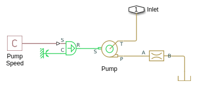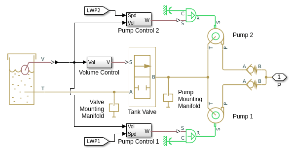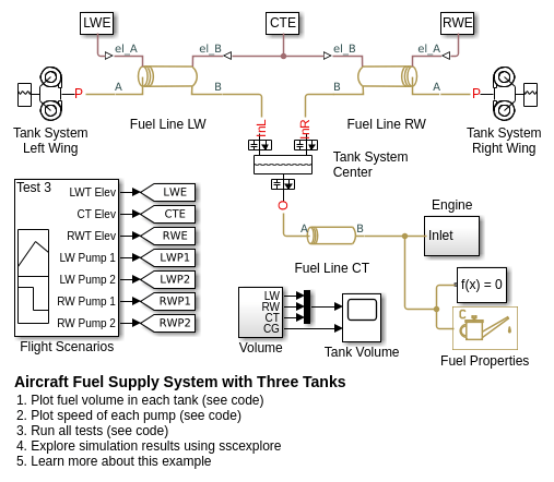 Система подачи топлива, представленная в примере, состоит из трех баков и двигателя. Двигатель подается из центрального бака, а топливо из левого бака крыла и правого бака крыла перекачивается в центральный бак соответствующими насосными станциями. Каждая насосная станция состоит из двух центробежных насосов, соединенных параллельно с обратными клапанами, установленными в выходных отверстиях насоса для предотвращения обратного потока. Насосы приводятся в действие главными двигателями с скоростью вращения 7200 об/мин. Движители моделируются идеальным источником скорости вращения.