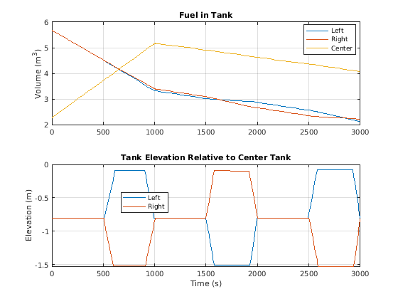 На графиках ниже показано количество топлива, остающегося в баках. Скорость потребления топлива из каждого бака зависит от перепада давления через линии топлива из-за изменения повышения относительно центрального бака.