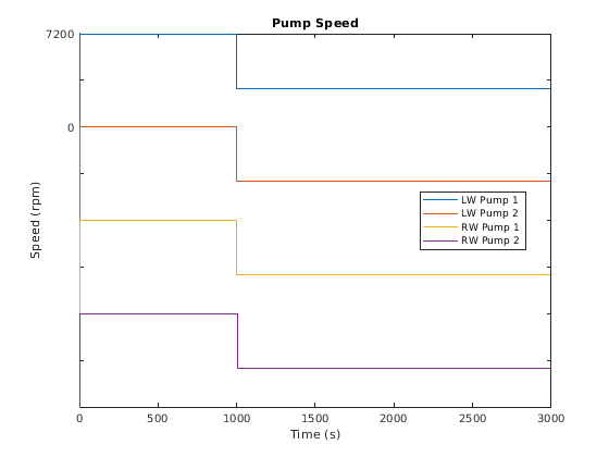 На графиках ниже показана скорость для всех четырех насосов в системе подачи топлива. Для некоторых тестовых последовательностей скорости насоса падают ниже максимальной скорости, чтобы наблюдать эффект на уровни топлива в баках.