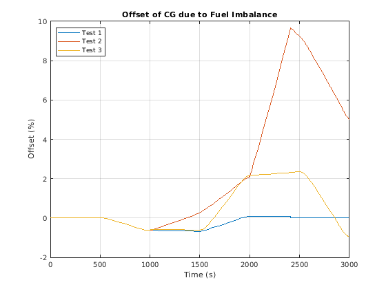 Рисунок ниже показывает смещение CG от топлива на самолете в процентах от половины расстояния между левым и правым топливными баками. Графики показывают результаты для трех тестов, где срабатывают различные комбинации отказов насоса.