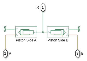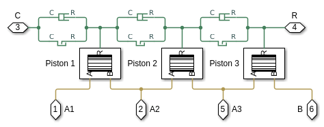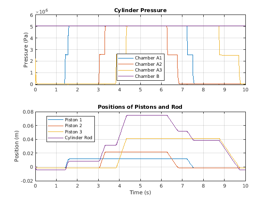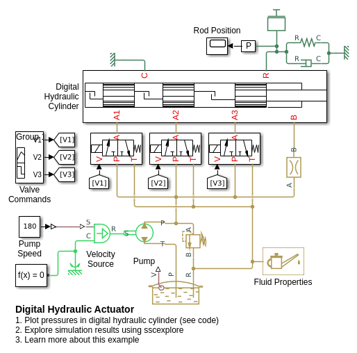 Этот пример показывает цифровой гидравлический привод, которая состоит из 3 гидроцилиндров двойного действия, установленных в том же интерпретаторе и соединенных между собой через жёсткие упоры. Зазор между крайним левым поршнем и оболочкой равен 2 ^ 0 * base _ length, зазор между первым и вторым поршнями установлен на 2 ^ 1 * base _ length, а зазор между вторым и третьим поршнями установлен на 2 ^ 2 * base _ length. Площадь базового поршня в самой правой ёмкости составляет половину площади других ёмкостей. Самая правая ёмкость постоянно соединяется с насосом, в то время как другие три ёмкости соединяются или с насосом, или с баком в зависимости от 2-х позиционных трехходовых электрогидравлических клапанов. В результате 2 ^ 3 дискретных положения могут быть достигнуты в диапазоне 2 ^ 3 * base _ length.