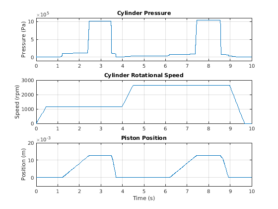 На графиках ниже показаны давление, скорость и расширение вращающегося гидравлического цилиндра. Несколько более высокое давление наблюдается во втором штрихе из-за более высокой скорости вращения цилиндра.