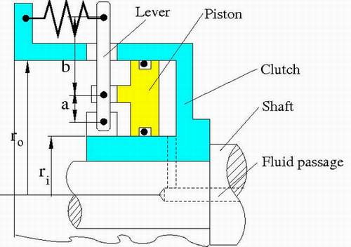 Этот пример показывает типичный гидроцилиндр, используемый для управления фрикционными муфтами, тормозами и другими устройствами, установленными на вращающихся валах. Ключевым элементом привода является поршень, который движется назад и вперед под давлением, обеспечиваемым через центральное сверло в валу и через каналы в муфте. В этом примере привод действует на предварительно нагруженную пружину, которая имеет тенденцию прижимать поршень к стенке муфты.