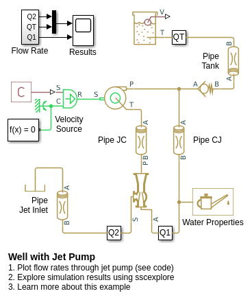 Этот пример показывает установку скважинного струйного насоса. Установка скважинного струйного насоса, представленная в этом примере, состоит из поверхностного центробежного насоса и струйного насоса, установленного в скважине ниже поверхности воды.