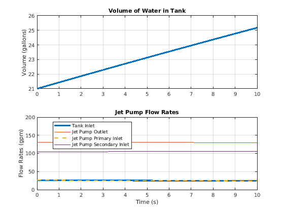 На графиках ниже показа скорости потока жидкости в струйный насос и из него и объем бака с водой.