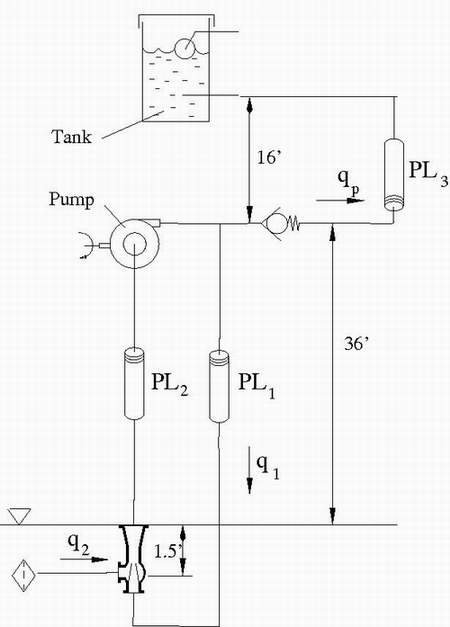 Давление на выходе центробежного насоса составляет 20 фунт/кв. дюйм, и ожидается, что его подача в номинальных условиях составит около 130 галлонов/мин. Трубопровод между выходным отверстием центробежного насоса и входным отверстием струйного насоса имеет диаметр 2 дюйма и имеет длину 37,5 футов. Диаметр трубопровода, соединяющего выход струйного насоса и вход центробежного насоса, составляет 4 дюйма, и он имеет длину 36 футов. Выход насоса разделен на две части: одна проходит через запорный клапан в бак, а остальное отводится на вход струйного насоса. Поставка насосного узла должна быть более 25 галлонов в минуту. Центробежный насос NPSH должен быть больше 2 фунт/кв. дюйм.