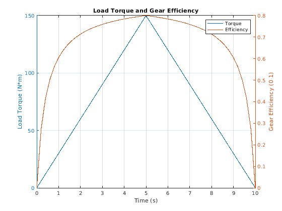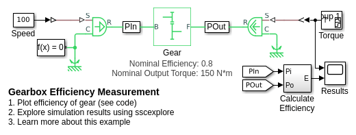 Этот пример показывает тест на измерение эффективности коробки передач. Вал входа вращается с фиксированной скоростью, и переменный крутящий момент прикладывается к валу выхода. Степень измеряется как на вход, так и на выход валах, а эффективность вычисляется как отношение выхода к входной степени. Результаты симуляции соответствуют параметрам, заданным для эффективности передачи.