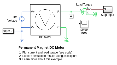 Связи R и C являются портами механического вращений, которые соединяют блок с узлами, движение которых контролируется. Связи W и A являются выходными портами физического сигнала для скорости и углового смещения, соответственно.