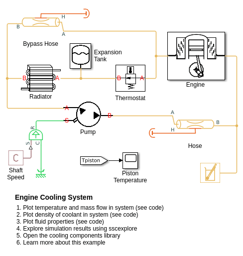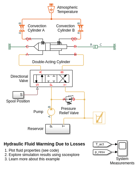 Порт A является портом терможидкости, сопоставленным с входным отверстием конвертера. Порт H является тепловым портом, сопоставленным с температурой жидкости внутри конвертера. Порты R и C являются портами механической передачи, сопоставленными с движущимся интерфейсом и корпусом конвертера, соответственно.