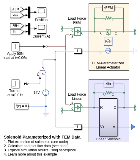 Блок FEM-Parameterized Linear Actuator реализует модель линейного привода, заданную в терминах магнитного потока. Используйте этот блок для моделирования пользовательских соленоидов и линейных двигателей, где магнитный поток зависит от обоих дистанционных переменных тока. Вы параметризоваете блок, используя данные из стороннего пакета магнитного конечноэлементного метода (FEM).