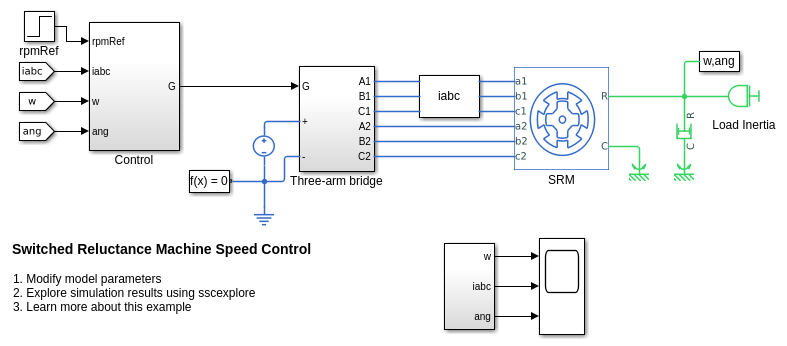 Блок Switched Reluctance Machine представляет трехфазную переключенную реактивную машину (SRM). Статор имеет три пары полюсов, несущих три обмотки мотора, а ротор имеет несколько немагнитных полюсов. Двигатель создает крутящий момент путем возбуждения пары полюсов статора, создания силы на ближайшие полюсы ротора и тяги их к выравниванию. Схема показывает конструкцию мотора.