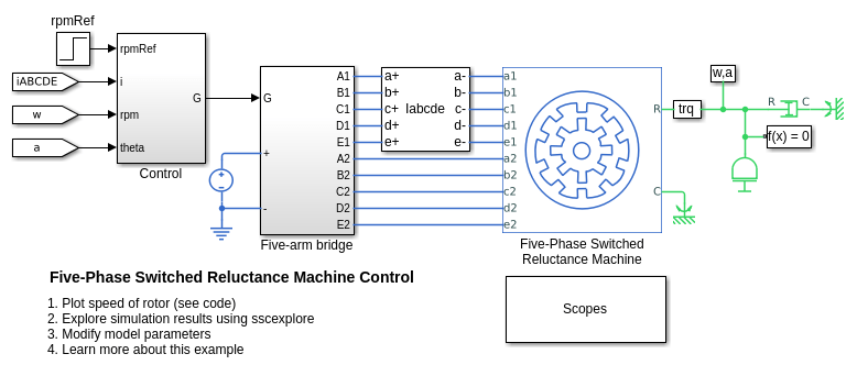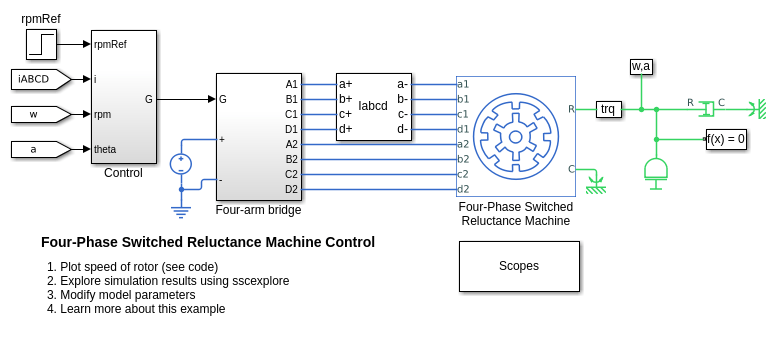 Блок Switched Reluctance Machine (Multi-Phase) представляет четырёх- или пятифазную переключенную реактивную машину (SRM).