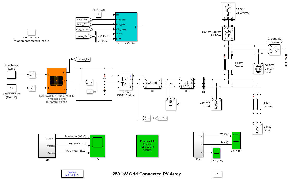 В этом примере показана подробная модель 250-kW массива PV, соединенного с 25-kV сеткой через трехфазный преобразователь.