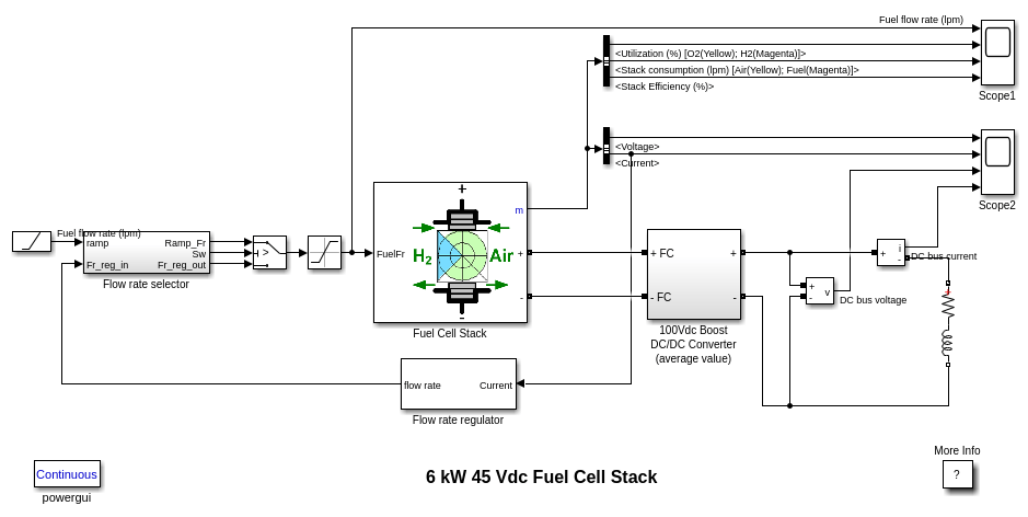 Напряжение топливной камеры, ток, напряжение преобразователя постоянного/постоянного тока и сигналы тока преобразователя постоянного/постоянного тока доступны на Scope2. Скорости потока жидкости топлива, использование водорода и кислорода, потребление топлива и воздуха и эффективности доступны на Scope1.
