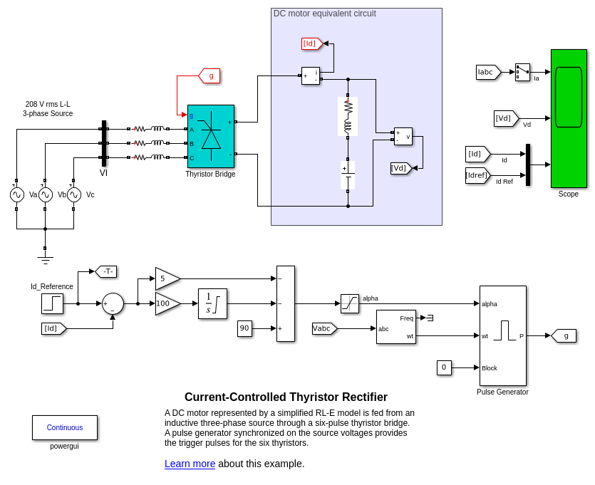 Двигатель постоянного тока, представленный упрощенной моделью RL-E, питается от индуктивного трехфазного источника через шестиимпульсный тиристорный мост. Импульсный генератор, синхронизируемый от входных напряжений, обеспечивает триггерные импульсы для этих шести тиристоров.