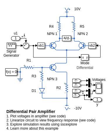 Этот пример показывает схему усилителя дифференциальной пары. Схема может использоваться, чтобы исследовать свойства усилителя дифференциальной пары. Модель может быть протестирована с помощью дифференциальных и общих входов. Сбалансированный выход имеет нулевой коэффициент усиления в общем режиме при условии, что два транзистора имеют одинаковые свойства.