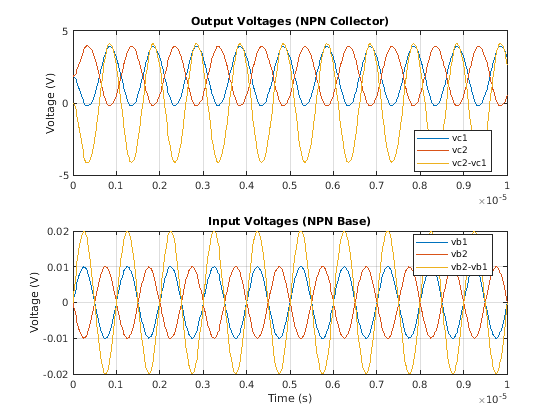 Рисунок ниже показывает вывод и вход модели усилителя дифференциальной пары. Различие в базовых напряжениях (vb2-vb1) усиливается более чем в 40 раз. Выход измеряется как различие между двумя выходами коллектора (vc2-vc1).