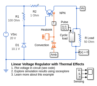 Этот тип модели может использоваться, чтобы подтвердить, что выбранные компоненты схемы приводят к адекватному уровню регулирования напряжения. Он также может использоваться для определения размера теплоотвода, необходимого для поддержания температуры транзисторного соединения в допустимой рабочей области значений. Путем моделирования как электрических, так и тепловых свойств получено понимание компромиссов между выбором электрических и тепловых параметров.