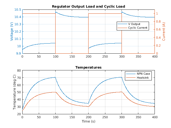 График ниже показывает выход регулятора напряжения, держащийся вблизи желаемой выходной мощности 10 В. Он также показывает температуру корпуса NPN и его теплоотвода, когда циклическая нагрузка включается и выключается.