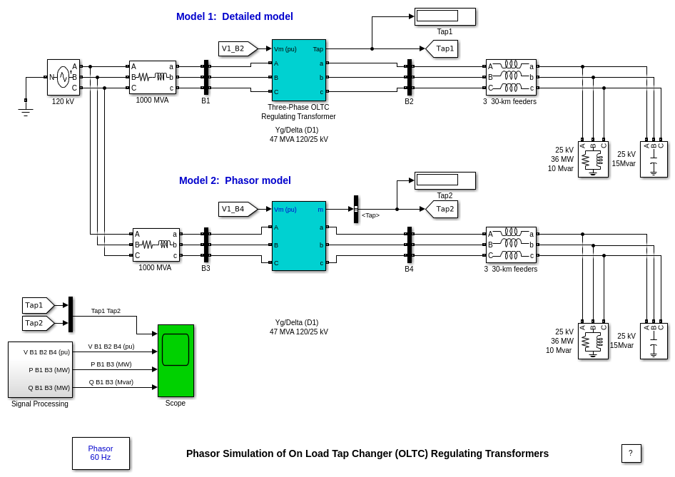 Обе модели трансформаторов OLTC реализуют трехфазный регулирующий трансформатор номиналом 47 МВА, 120 kV/25 кВ, Уай/Дельта, с подключенным на стороне высокого напряжения ОЛТК (120 кВ). Трансформаторы OLTC используются для регулирования напряжения системы на шинах 25 кВ B2 и B4.