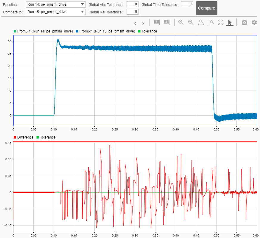 Первый график показывает наложение результатов симуляции решателя Backward Euler и Partitioning. Второй график показывает, чем они отличаются. Допуск по умолчанию для различий 0. Чтобы определить, соответствует ли точность результатов вашим требованиям, можно настроить относительные, абсолютные и временные допуски. Для получения дополнительной информации см. «Сравнение данных моделирования».