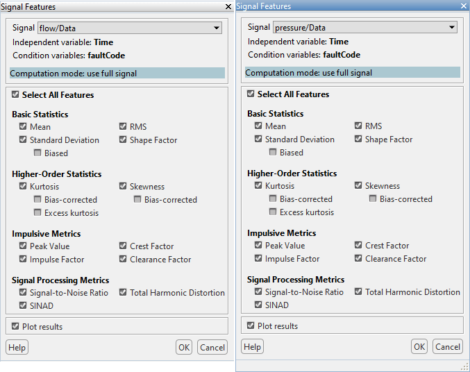 Извлеките функции сигнала временной области из сигнала потока и давления. На вкладке Feature Designer нажмите Временной Интервал Features > Signal Features и выберите все функции.