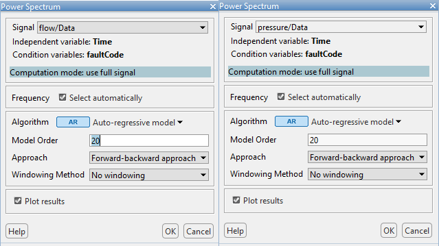 Как описывает Analyze and Select Features for Pump Diagnostics, вычисление частотного спектра потока подчеркивает циклическую природу сигнала потока. Оцените частотный спектр с помощью Spectral Estimation > Power Spectrum с помощью опций, показанных как для потока, так и для давления.